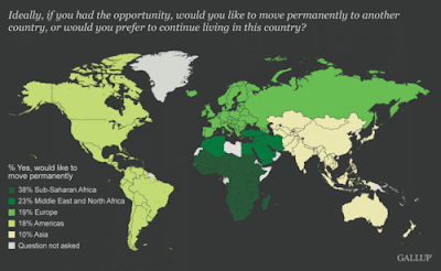According to a two year survey of 135 countries, Gallup estimates that 700 million adults in the world (16% of the adult population) would like to live in a different country, with about 25% naming the United States as their dream home. Canada is the second-most popular choice.In general, Asians, South Asians, and Australians are most content where they are. Perhaps unsurprisingly, Sub-Saharan Africans are the most desirous to leave their home countries.The rest of the top desired destination countries (those where an estimated 25 million or more adults would like to go) are predominantly European. Forty-five million adults who would like to move name the United Kingdom or France as their desired destination, while 35 million would like to go to Spain and 25 million would like to relocate to Germany. Thirty million name Saudi Arabia and 25 million name Australia.