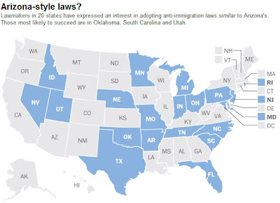 The Washington Post tracks the states looking to copy Arizona's racist anti-immigrant law.Lawmakers in Oklahoma, South Carolina and Utah, which have already taken steps against illegal immigration, say that Arizona-style measures have a realistic chance of passing when their legislatures reconvene in 2011. The Obama administration sued Arizona in federal court Tuesday, charging that the state law usurps federal authority, would hamper immigration enforcement and would lead to police harassment of those who have no proof of lawful status. The government asked that a federal judge stop the law from taking effect July 29. Legislators in at least 17 other states introduced bills this year similar to the Arizona law, which allows officers to question anyone they suspect of being in the country illegally. But most of those measures are not considered likely to be adopted or signed by governors. The political climate in Oklahoma, South Carolina and Utah, however, improves the chances that state legislatures there could follow Arizona's lead in 2011.