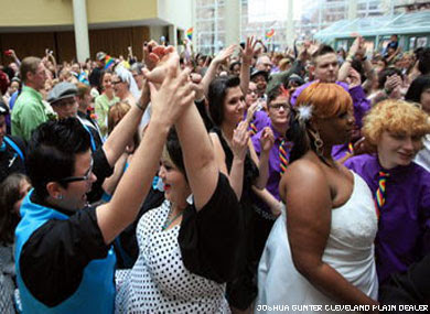 Thousands gathered in Cleveland yesterday for a mass protest wedding of over 250 gay couples. While some were dressed in more casual attire they all had the same intention: to send a message to the state of Ohio to recognize same-sex marriage. Sierra Chapman, 25 and Sandy Thomas, 48, both of Cleveland, recreated a private service held three years ago. "We wanted to do this in a joint ceremony with people who are like us," said Chapman. "My parents are okay with it, but they didn't want to come to watch." Hundreds of friends and relatives of the brides and grooms joined the celebration as eight priests and ministers recited marriage vows to couples of all ages. The afternoon ceremony followed more than an hour of speeches by activists on the steps of Cleveland City Hall, where a gay pride flag flew under the American flag.