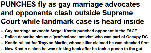 Midway through a National Organization protest in front of the US Supreme Court building, punches flew. One, which landed on the face of a marcher, was thrown by gay marriage advocate Sergei Kostin, a former Occupy DC member whom a source in the Washington, DC Metropolitan Police Department described as a 'professional activist.' The other was a gut-punch that Kostin told MailOnline provoked him - one that no one else saw. If that punch flew, one observer countered, however, it's not clear how hard it could have been.The Daily Mail story also implies that Kostin is a hypocrite to "Gandhism" for fighting back. The article was tweeted out approvingly this morning by Matt Barber with his notation that this is yet another example of "liberal tolerance."