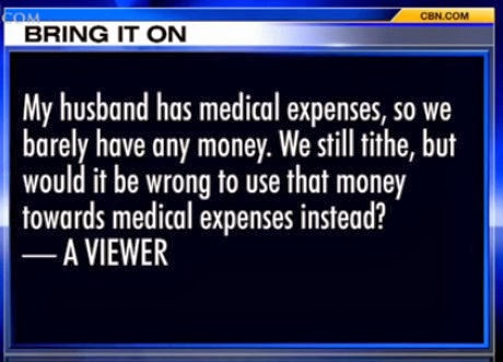 In today's "Bring It Online" segment on the 700 Club, Pat Robertson fielded an email from an elderly woman who is living on Social Security and wonders if it would be a sin to stop tithing in order to help pay her sick husband's medical bills. Robertson responded: "Read carefully what the bible has to say in Malachi. He says, 'Prove me with your tithes and offerings and I will rebuke the devourer for your sake.' Your husband has all these medical problems because the devourer has not been rebuked! You need to rebuke him, you give your tithes faithfully and God, he says, 'I will rebuke the devourer, the person who is eating up your money and eating up your health.' So, you want to be healthy, that's a promise in the word!" Start at the 3:20 mark in the clip below.