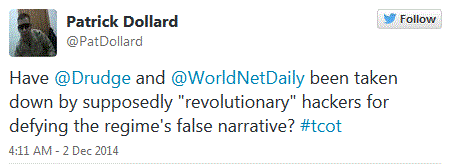The Drudge Report and the conservative news site WND.com were both down early Tuesday morning for at least two hours — a curious coincidence that came amid the FBI’s warning of a widespread malicious software attack that began with a security breach at Sony Pictures Entertainment. The Blaze reported both websites were off-site for hours and gave visitors the message: “This webpage is not available.” It’s not clear if the website difficulties at Drudge and WND.com were tied to the cyberattack, or if their host was simply experiencing an outage. But the timing is suspicious.