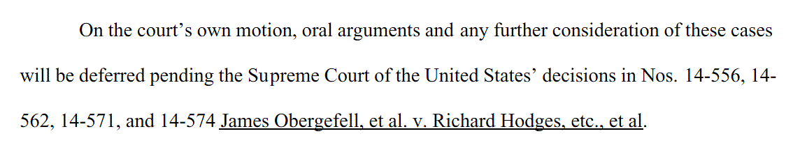 "On the court's own motion, oral arguments and any further consideration of these cases will be deferred pending the Supreme Court of the Unites States' decisions in James Obergefell v Richard Hodges."