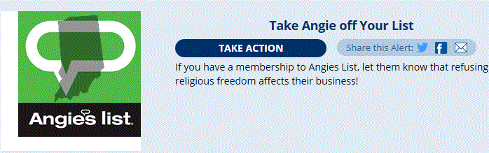 Angie’s List, a company that lists crowd-sourced recommendations for local services, decided that religious freedom wasn’t good for business and has threatened to suspend plans to expand its Indianapolis headquarters because of the passage of the law. Bottom line: Angie’s List takes the position that religious freedom is bad for business. We, on the other hand, think freedom is the foundation for good business. Businesses that undermine freedom -- especially our First Freedom -- ultimately undermine their own business. If you have a membership to Angie’s List, I urge you to cancel your membership and show them that as a supporter of religious liberty, you won’t stand for paying dues to a company that disregards the freedom of people to live their daily lives according to what they believe. When you cancel, politely let them know the reason why.The FRC's boycott announcement came hours after the same move yesterday by the AFA's One Million Moms.