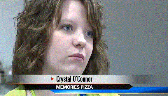A small-town pizza shop is saying they agree with Governor Pence and the signing of the controversial Religious Freedom Restoration Act. The O'Connor family, who owns Memories Pizza, says they have a right to believe in their religion and protect those ideals. “If a gay couple came in and wanted us to provide pizzas for their wedding, we would have to say no,” says Crystal O'Connor of Memories Pizza.What kind of wedding serves take-out pizza? (Tipped by JMG reader Scott)