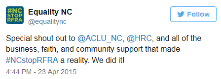 "Today, true North Carolina values of fairness and justice prevailed with the announcement that the state's so-called 'Religious Freedom Restoration Act" (or RFRA) would no longer be considered in the General Assembly's 2015-2016 session, said Equality NC Executive Director Chris Sgro. "This decision is a testament to the actions of thousands of North Carolinians--from business leaders to faith communities to a majority of North Carolina voters--who made their voices heard over the past several months through emails, letters, calls and in-person meetings and who pushed back on the notion that religion should ever be used to discriminate against North Carolinians."