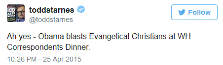Starnes is probably referring to this line: "I tease Joe sometimes, but he has been at my side for seven years, I love that man. He's not just a great vice president, he is a great friend. We've gotten so close in some places in Indiana, they won't serve us pizza anymore." Or maybe this one: "Rick Santorum announced that he would not attend the same-sex wedding of a friend or a loved one, to which gays and lesbians across the country responded, 'That's not gonna be a problem.'" The president's full speech is below.