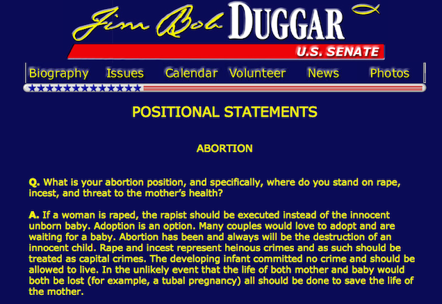 In a brief statement to People, Jim Bob and Michelle said last week that “that dark and difficult time caused us to seek God like never before.” Maybe that’s because Jim Bob publicly stated during his 2002 campaign for U.S. Senate that he thinks incest should be punishable by death. Jim Bob’s platform on his campaign website—preserved via web cache—states that he believes “rape and incest represent heinous crimes and as such should be treated as capital crimes.” Jim Bob offered this belief to explain his position on abortion (only acceptable if both the mother and the baby were going to die anyway, of course). Jim Bob lost the Republican nomination for Senate to Arkansas’ incumbent Senator Tim Hutchinson. His son Josh remained very much alive and went on to molest several underage girls including some of his sisters from 2002-2003.During his single term in the Arkansas House, then state Rep. Jim Bob Duggar sat on the Corrections, Criminal Law, and Judiciary committees. Ahem.