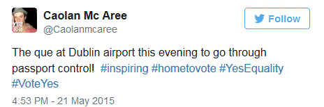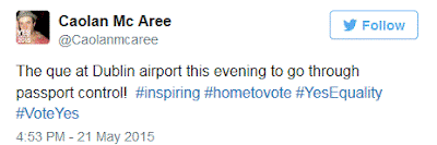 Thousands of Irish ex-pats have swarmed airports over the last 24 hours as they return home to vote in today's referendum. Follow along on Twitter. (Tipped by JMG reader Gerard)