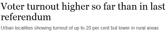 Turnout in the world’s first referendum on same sex marriage and on the age of candidates for the presidency is reported to be brisk. Some urban areas estimated that 20 per cent of the electorate have cast their vote but voting is slower in many rural areas. Ireland is the first country to vote on marriage equality and in Dublin some turnout was seen as quite high for lunchtime. Returning officers expect voting to increase significantly by tea-time with most people in employment expected to vote between 7pm and 10pm when polling finishes. In a number of polling stations in Galway city queues were reported before polling opened at 7am. In city areas of Cork polling hit 12 per cent by 1pm. Across the country in Mayo voting was estimated at 17 per cent in Westport by lunchtime and about 10 per cent or 11 per cent in Castlebar.RELATED: Bookmakers Paddy Power are putting the odds at 10/1 in favor of the Yes vote.