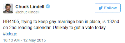 Texas state Rep. Cecil Bell's bill to triple-super-extra ban same-sex marriage will likely not be heard today. The Texas House has until midnight on Thursday to pass bills that originate in their chamber. The legislative session ends on June 1st.