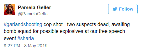 Armed police officers rushed in to the Mohammed Art Exhibit and Contest and quickly removed Pamela Geller and whisked her away to safety after a gunfight erupted outside of the event. A law enforcement officer and two suspects are reportedly down, according to police on the scene. Three Breitbart Texas reporters are locked down inside of the event. The officers on the scene said that possible explosives were found. The extrication of Geller occurred during a live video interview with Breitbart Texas. The attendees to the exhibit were forced into lockdown by police. Several officers entered to exhibit and informed the attendees that an officer was down, two suspects had been shot, and that possible explosives were found.UPDATE: From the Dallas Morning News: