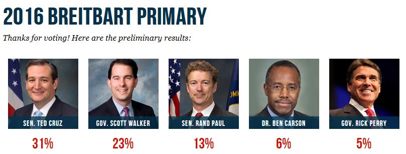 Breitbart has launched a 2016 straw poll of its readers. Leading the field at this writing is Sen. Ted Cruz, much to the shock of absolutely nobody. You have to register for the Breitbart spam list to see the voting results, but I went ahead and took the hit for you.