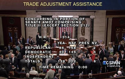 President Obama suffered a major defeat to his Pacific Rim free trade initiative Friday as House Democrats helped derail a key presidential priority despite his last-minute, personal plea on Capitol Hill. The House voted 302 to 126 to sink a measure to grant financial aid to displaced workers, fracturing hopes at the White House that Congress would grant Obama fast-track trade authority to complete an accord with 11 other Pacific Rim nation.The Tea Things are doing cartwheels across Twitter.