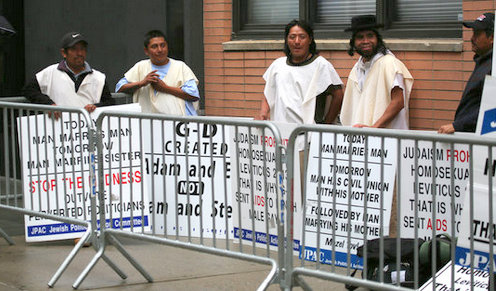 Some of the most curious costumes worn along the parade route belonged to protesters. Behind a barricade, a group of men wore the fringed Jewish prayer garment known as the tzitzit and held up anti-gay signs bearing the logo of a group calling itself the Jewish Political Action Committee. “Judaism prohibits homosexuality,” one sign read. But the men were not Jewish. They were Mexican laborers, protesting because they were paid to protest, said one of the men, who would not give his name. Heshie Freed, a member of the political action committee, an Orthodox Jewish group based in Brooklyn, said that the men were supplementary troops, filling in for the Jewish students who would normally be called upon to demonstrate. “The rabbis said that the yeshiva boys shouldn’t come out for this because of what they would see at the parade,” Mr. Freed said.Last month the SPLC added JPAC to its list of anti-gay hate groups.