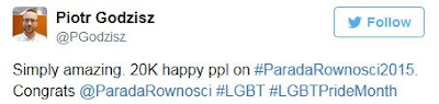The participants carried placards with political messages. They said: ‘We too are family’, ‘Marriage for everyone with the right to adoption', and ‘Yes to the right [for] gender reconciliation’. Poland has no legal rights for same-sex couples, though the issue has been debated in the Parliament of Poland; the country is predominately Catholic. Małgorzata Fuszara, the Government Plenipotentiary for Equal Rights, headed the parade. She said of the march: ‘This is a march in the interest of us all, the whole of Poland, so that our society becomes one where people are open, free and show solidarity. To make it strong and diverse.’ Polish celebrities and MPs also attended the parade in support of its message for equality: including Poland’s first openly gay mayor, Robert Biedroń.Poland enacted a constitutional ban on same-sex marriage in 1992. Gays are protected from employment discrimination and serve openly in the military.
