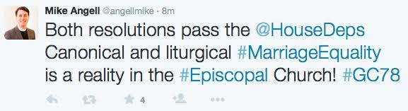 Bishops and Deputies at the Episcopal Church's 78th General Convention have authorized a gender-neutral marriage rite that officially brings same-sex marriage to the 1.8 million-member denomination. In 2012, Episcopalians authorized a "provisional rite" for the blessing of same-sex unions. That rite included an option for bishops in states where same-sex marriage was permitted to exercise "generous pastoral response" and allow use of the rite for same-sex marriage.